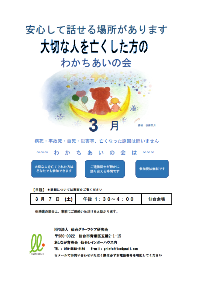 かけがえのない人との別れは誰もが経験し得る事。大切な人との死別により、深い悲しみ、辛さ、寂しさ、後悔、罪悪感、時に怒りや安堵など様々な思いや感情が沸き起こる。喪失に伴う様々な反応をグリーフと言います。グリーフは誰も代わることができません。